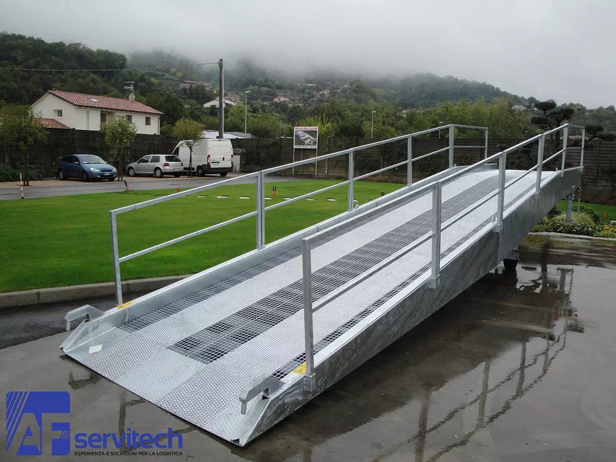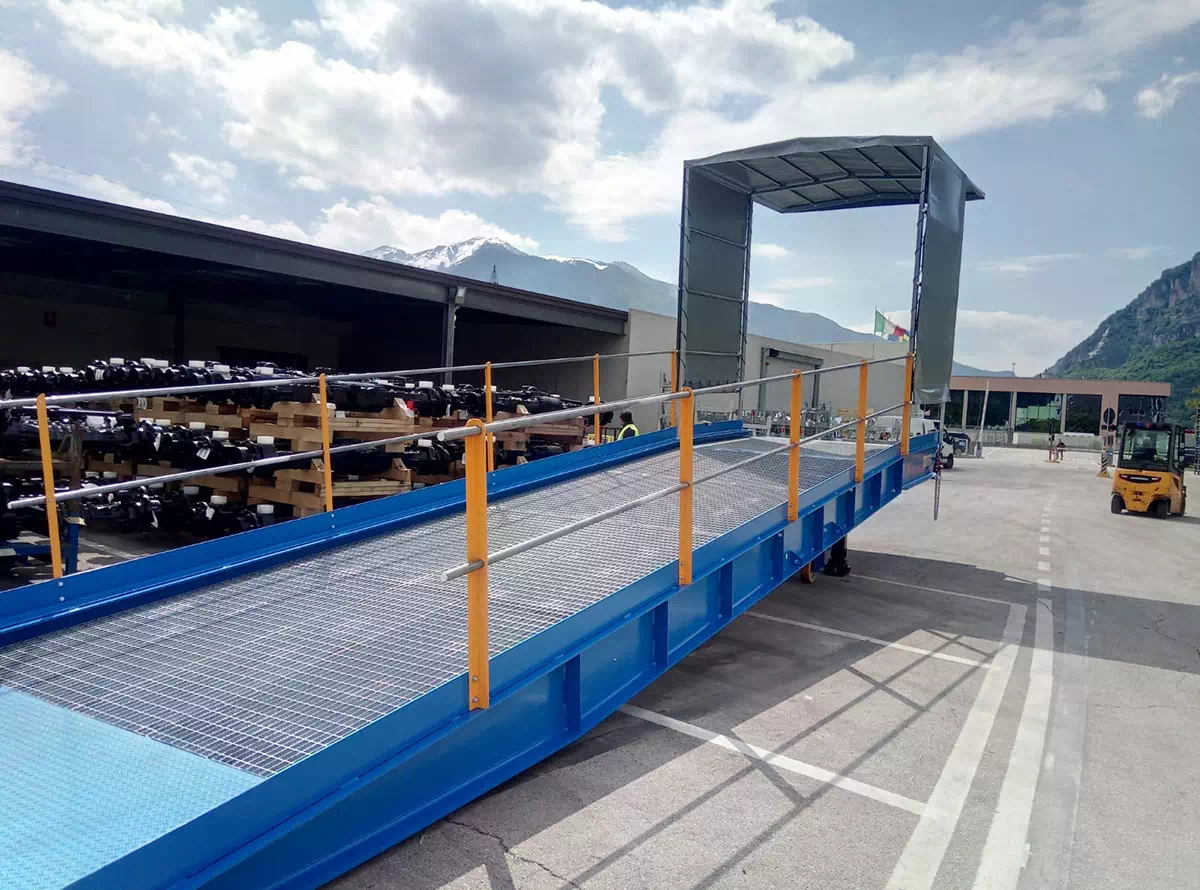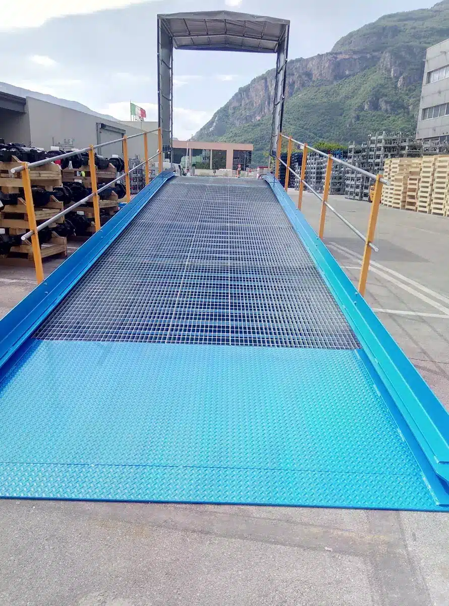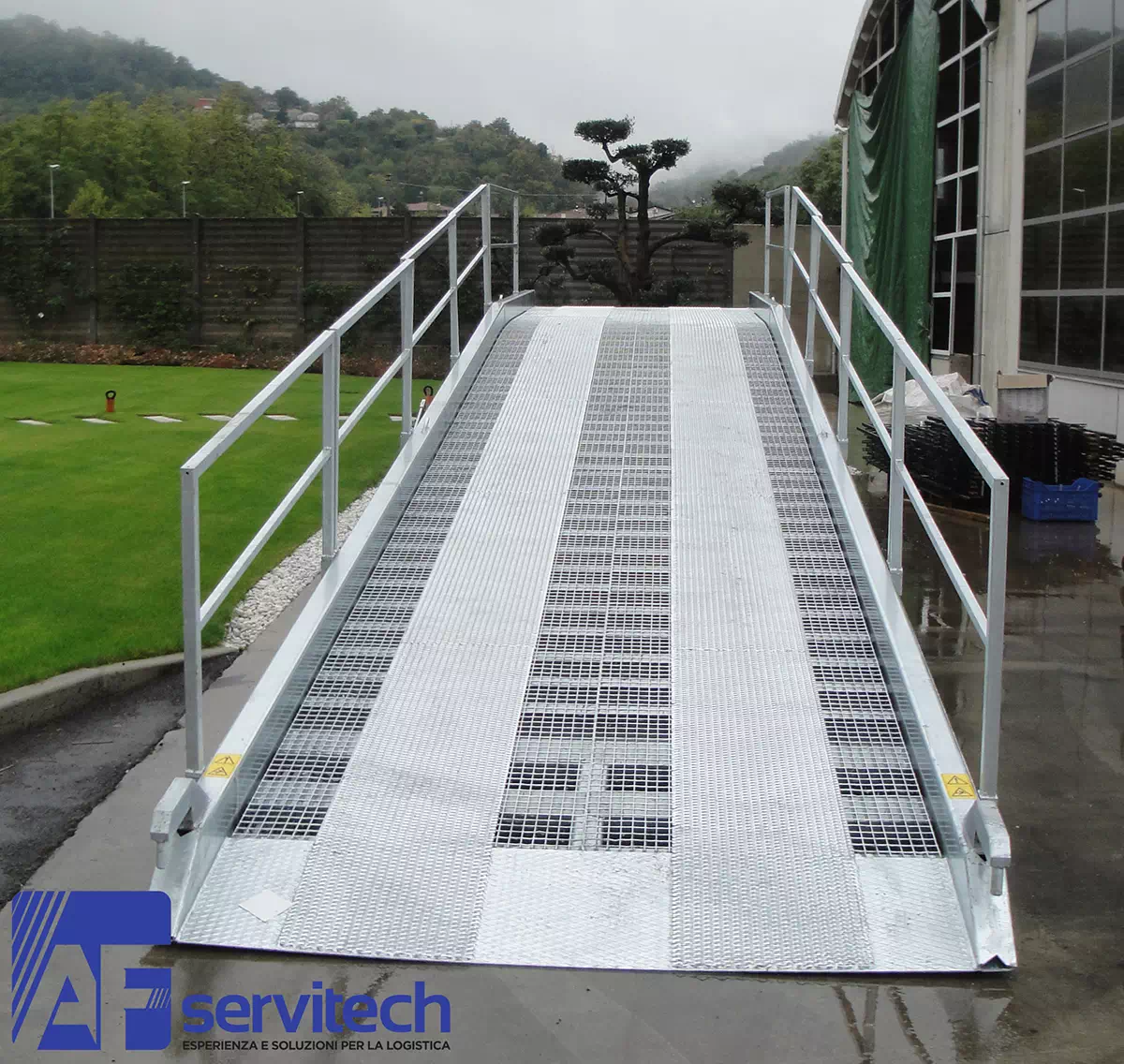 Le rampe di carico da piazzale permettono il carico-scarico dei mezzi in totale sicurezza, compensando la differenza di quota tra piano del piazzale e automezzo, carro ferroviario o container. Possono essere realizzate in esecuzione manuale o motorizzata e con struttura verniciata a polvere oppure interamente zincata a caldo, per garantire una notevole durabilità nel tempo.