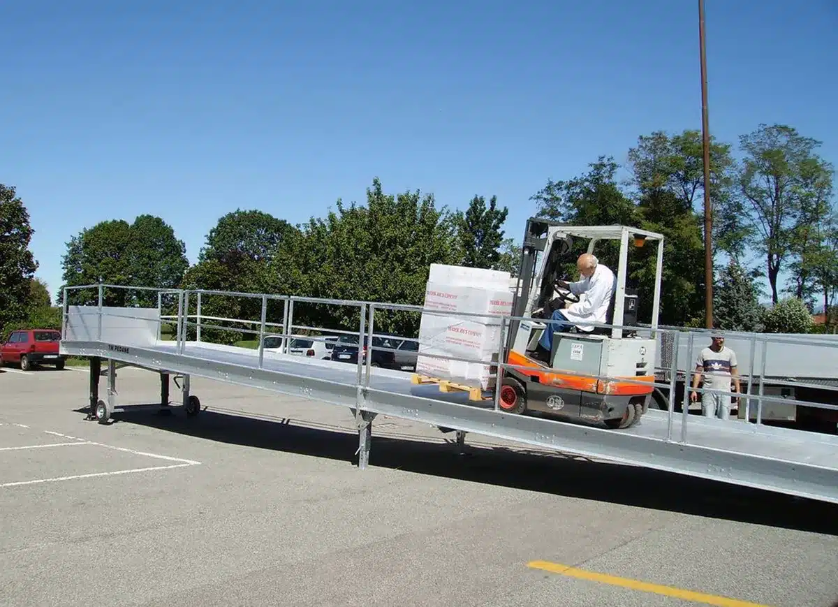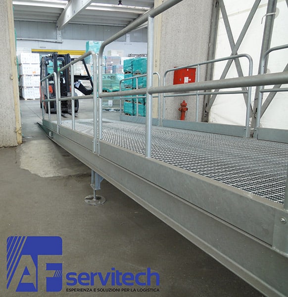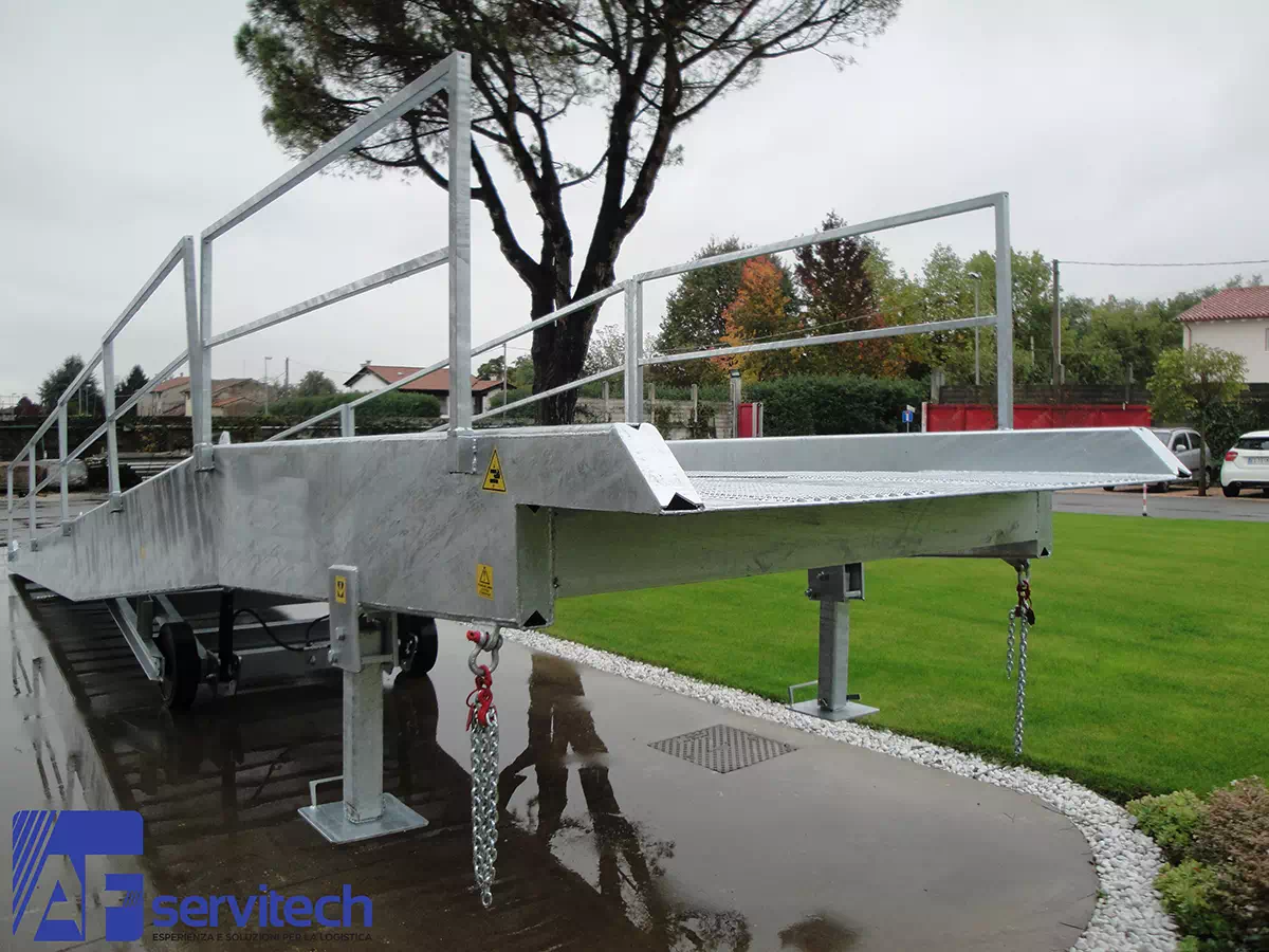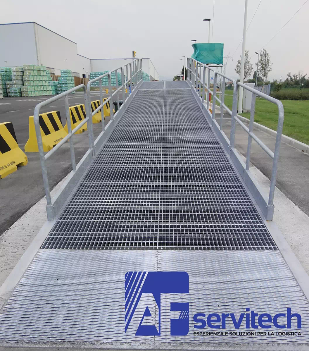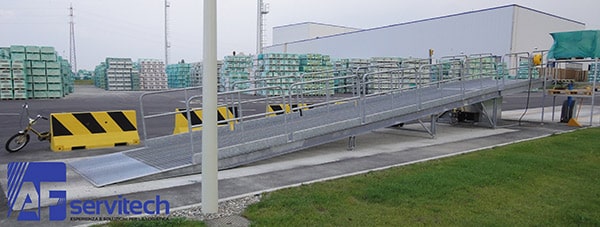 Le rampe di carico da piazzale permettono il carico-scarico dei mezzi in totale sicurezza, compensando la differenza di quota tra piano del piazzale e automezzo, carro ferroviario o container. Possono essere realizzate in esecuzione manuale o motorizzata e con struttura verniciata a polvere oppure interamente zincata a caldo, per garantire una notevole durabilità nel tempo.