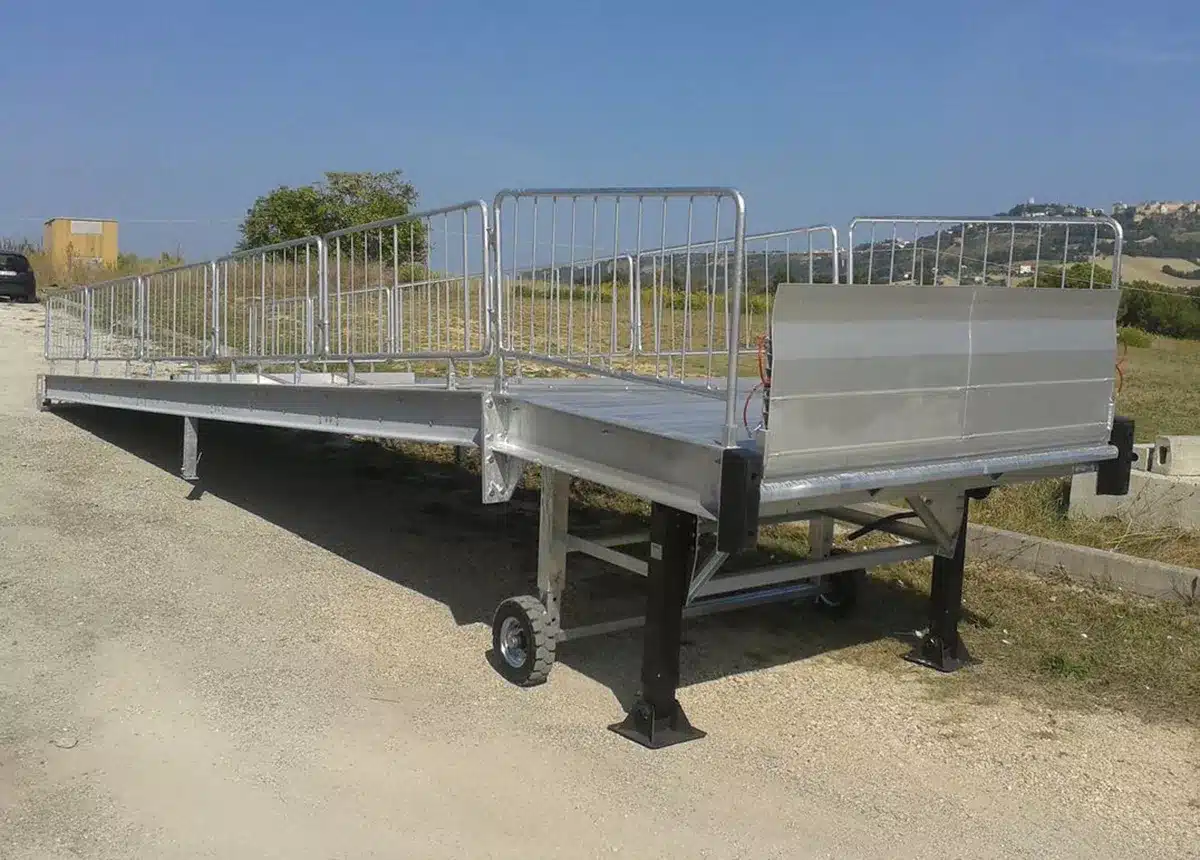 La rampa da piazzale standard viene fornita con: piano calpestio realizzato con grigliato cianfrinato antiscivolo, unghia di raccordo lato ingresso e di raccordo automezzo realizzata con lamiera mandorlata, finestrella di sollevamento per trasferimento rampa mediante carrello elevatore, ruote in acciaio teflon per permettere lo spostamento su piazzali in asfalto/cemento, manovella girevole per il sollevamento e l’abbassamento e parapetti laterali con predisposizione per copertura flessibile opzionale.