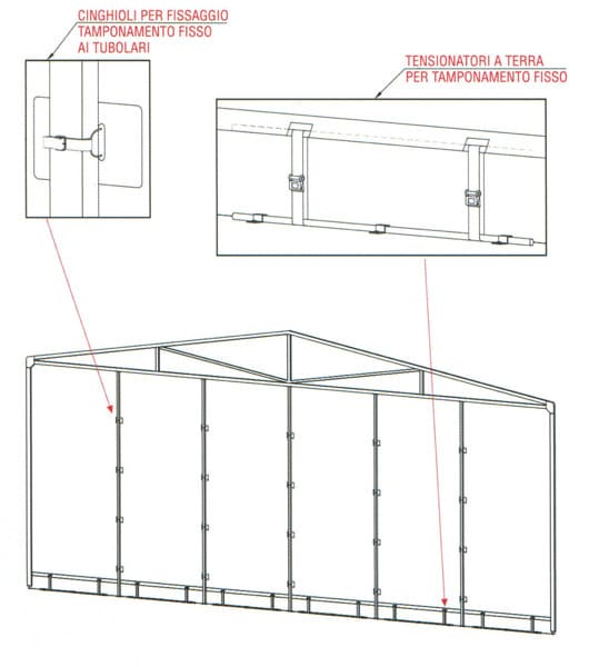 I tamponamenti fissi sono costituiti da una struttura tubolare di acciaio zincato tensionata alla pavimentazione mediante cinghie a cricchetto vengono. Il telo in PVC ignifugo antistrappo autoestinguente è tensionato alla struttura mediante cinghie a cricchetto certificate e regolabili.